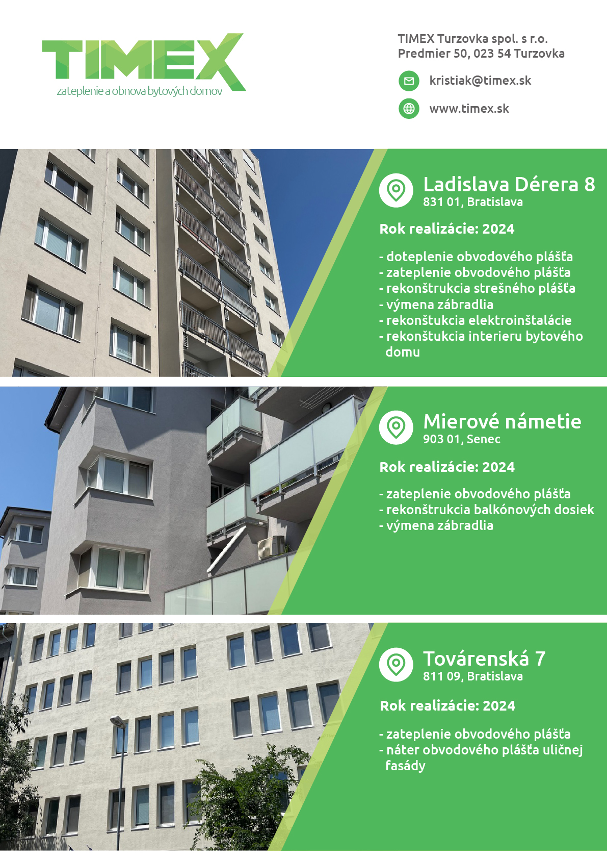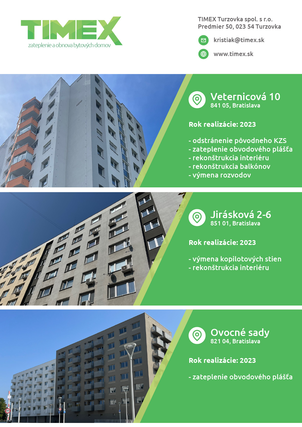 Pre náš bytový dom Hanulova 9 v Bratislave bola spoločnosť Timex hlavným partnerom pri generálnej rekonštrukcii nášho 14 poschodového bytového domu. Oceňujeme profesionálny prístup p. Krištiaka st. a stavbyvedúceho pána Štefana Kolesára, ktorý so zamestnancami spoločnosti Timex realizovali stavebné práce. Zároveň ďakujeme za ich zodpovedný a ľudský prístup. Rekonštrukcia sa uskutočnila 2021-2022.